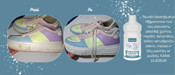 „Brilgrease“ yra labai efektyvus koncentruotas valiklis, kuris nuriebalina ir dezinfekuoja paviršius. Subalansuota formulė be amoniako ir fosfatų daro jį veiksmingu ir nepakeičiamu valant įsisenėjusius nešvarumus nuo visų plaunamų plastiko, gumos, medžio, keramikos, stiklo, nerūdijančio plieno, metalo ir kitų paviršių ar audinių. „Brilgrease“ taip pat tinka naudoti veikloje, kurioje taikoma savikontrolės sistema (HACCP), ir efektyviai pašalina riebalus, alyvą, dūmų dėmes, plutelių sankaupas, smogą, riebias dėmes ir nuosėdas, vašką, gumos žymes ir bet kokio kito tipo nešvarumus. Tūris 750ml.